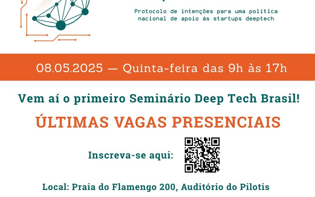 O Grupo de Trabalho formado por FINEP, BNDES, SEBRAE, CGEE, ABDE e outras entidades, a partir do Protocolo de Intenções das Deep Techs, está promovendo o 1º Seminário Deep Tech Brasil. O evento será realizado no dia 8 de maio, das 9h às 17h, em formato híbrido, e as inscrições ainda estão abertas.