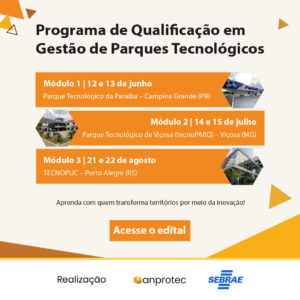 A Anprotec anuncia o lançamento do Programa de Qualificação em Gestão de Parques Tecnológicos, iniciativa que visa capacitar profissionais que atuam em ambientes de inovação com uma formação robusta, prática e alinhada às tendências globais. Com carga horária de 60 horas, o programa será realizado presencialmente em três módulos intensivos, sediados em parques tecnológicos que representam diferentes realidades do ecossistema brasileiro.