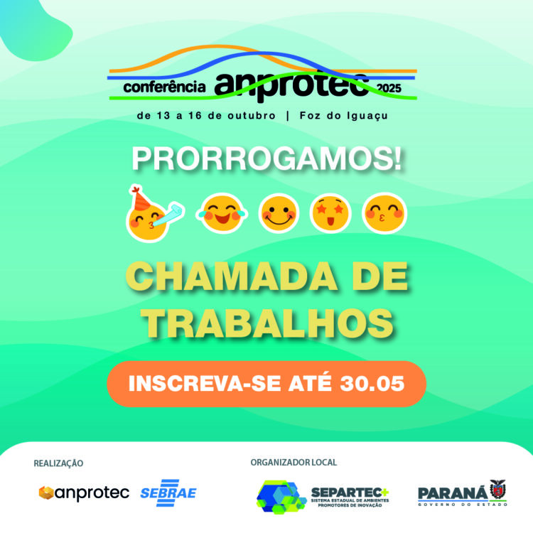 A Anprotec prorrogou o prazo de inscrições para a Chamada de Trabalhos da 35ª Conferência Anprotec. As inscrições podem ser feitas até o dia 30 de maio, e os autores terão a chance de apresentar seus artigos e relatos de boas práticas no evento, que acontecerá entre os dias 13 e 16 de outubro, em Foz do Iguaçu, no Paraná.