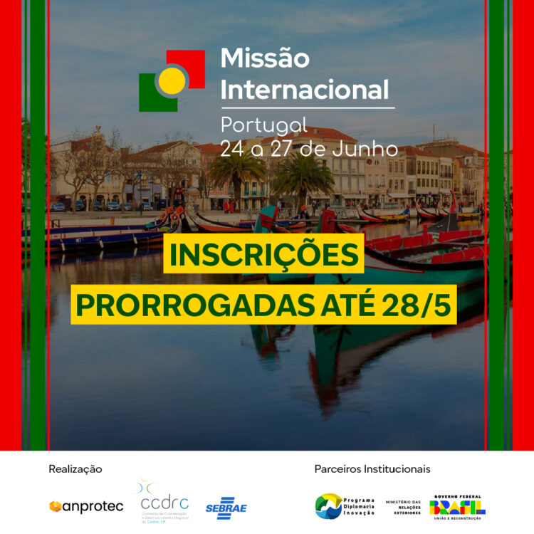 Atendendo a pedidos, a Anprotec prorrogou o prazo de inscrições para a Missão Internacional Portugal 2025. Interessados agora têm até 28 de maio para garantir sua participação na iniciativa, que será realizada entre os dias 23 e 26 de junho, em parceria com o Sebrae, o Ministério das Relações Exteriores (MRE) e a Comissão de Coordenação e Desenvolvimento Regional do Centro (CCDRC – Portugal).