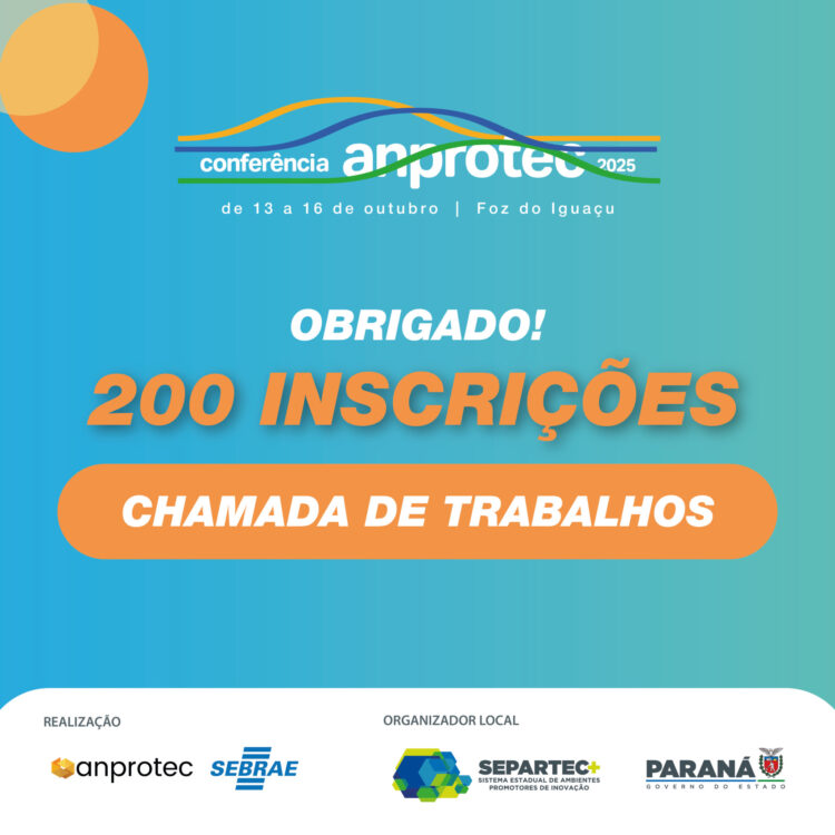 Mais uma vez, a Chamada de Trabalhos se consolida como um espaço para compartilhar conhecimento e experiências durante a Conferência Anprotec. Para a 35ª edição, o evento recebeu 200 submissões, que serão avaliadas e selecionadas para apresentação durante o encontro, que acontece entre os dias 13 e 16 de outubro, em Foz do Iguaçu.