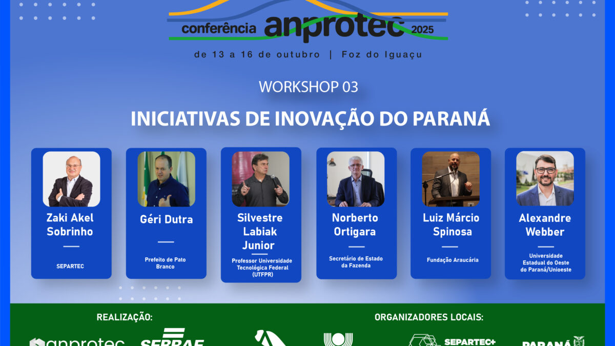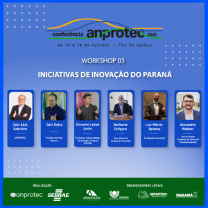 “Iniciativas de Inovação do Paraná” é o tema do Workshop 03, que acontece no dia 15 de outubro, durante a 35ª Conferência Anprotec, em Foz do Iguaçu. O objetivo é apresentar as ações que vêm colocando o Paraná como referência nacional em inovação.