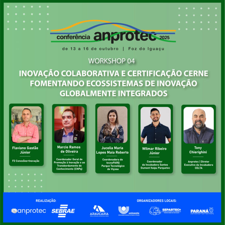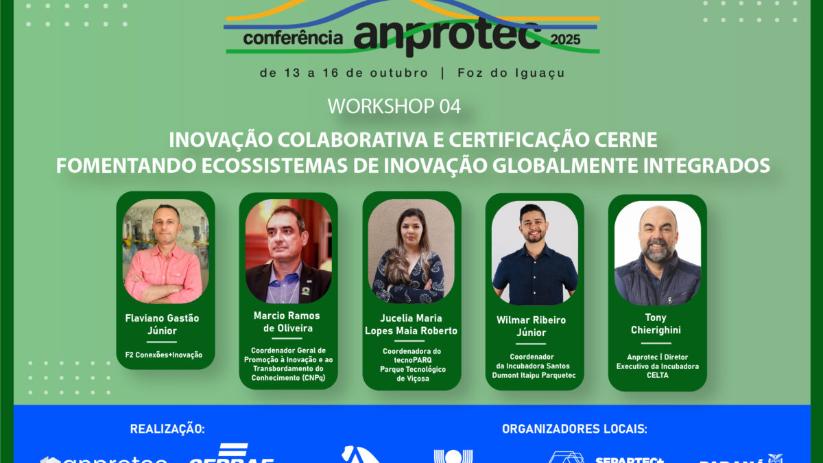 O Workshop 04 da 35ª Conferência Anprotec, que acontece em Foz do Iguaçu no dia 15 de outubro, abordará o tema “Inovação Colaborativa e Certificação Cerne: fomentando ecossistemas de inovação globalmente integrados”. A atividade está programada para o terceiro dia do evento.