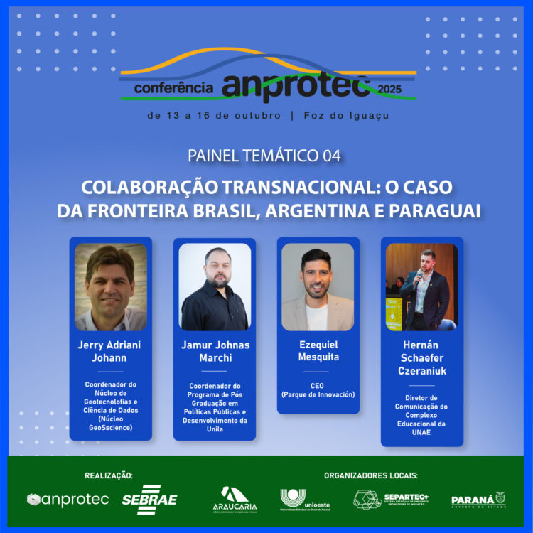 O Painel Temático 4 acontece no dia 14 de outubro, durante a 35ª Conferência Anprotec, em Foz do Iguaçu. O painel trará para debate o tema “Colaboração Transnacional: o caso da fronteira Brasil, Argentina e Paraguai”.