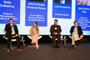 Anna Cláudia Alves de Souza, co-fundadora e diretora técnica da Recombine Biotech, apresentou um caso exemplar de como a colaboração universidade-empresa pode gerar inovação com impacto direto no mercado. A Recombine é um spin-off da Universidade Federal de Viçosa (UFV) voltado para pesquisa, desenvolvimento e produção de moléculas recombinantes.