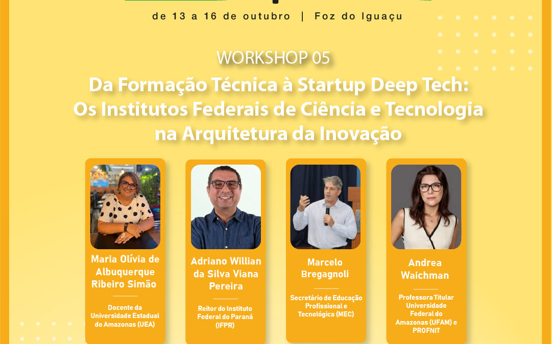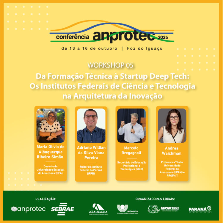 O Workshop 05 “Da Formação Técnica à Startup Deep Tech: Os Institutos Federais de Ciência e Tecnologia na Arquitetura da Inovação” acontece no dia 15 de outubro, durante a 35ª Conferência Anprotec, em Foz do Iguaçu.