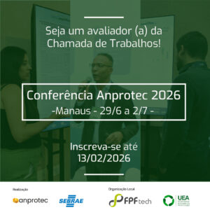 Profissionais e pesquisadores com experiência em inovação, empreendedorismo e áreas correlatas podem se inscrever até 13 de fevereiro para integrar o Comitê Avaliador da Chamada de Trabalhos da 36ª Conferência Anprotec. O evento será realizado em Manaus, de 29 de junho a 2 de julho de 2026.