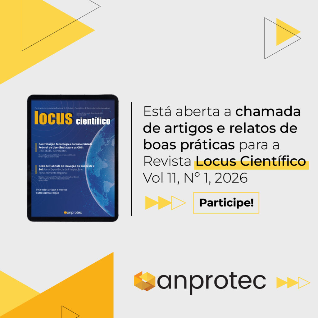 A Anprotec anuncia a abertura de submissões para a primeira edição de 2026 da Revista Locus Científico (Vol 11, Nº 1). A publicação, que retomou suas atividades em 2025, recebe trabalhos de pesquisadores, empreendedores e profissionais do ecossistema de inovação até 31 de março.