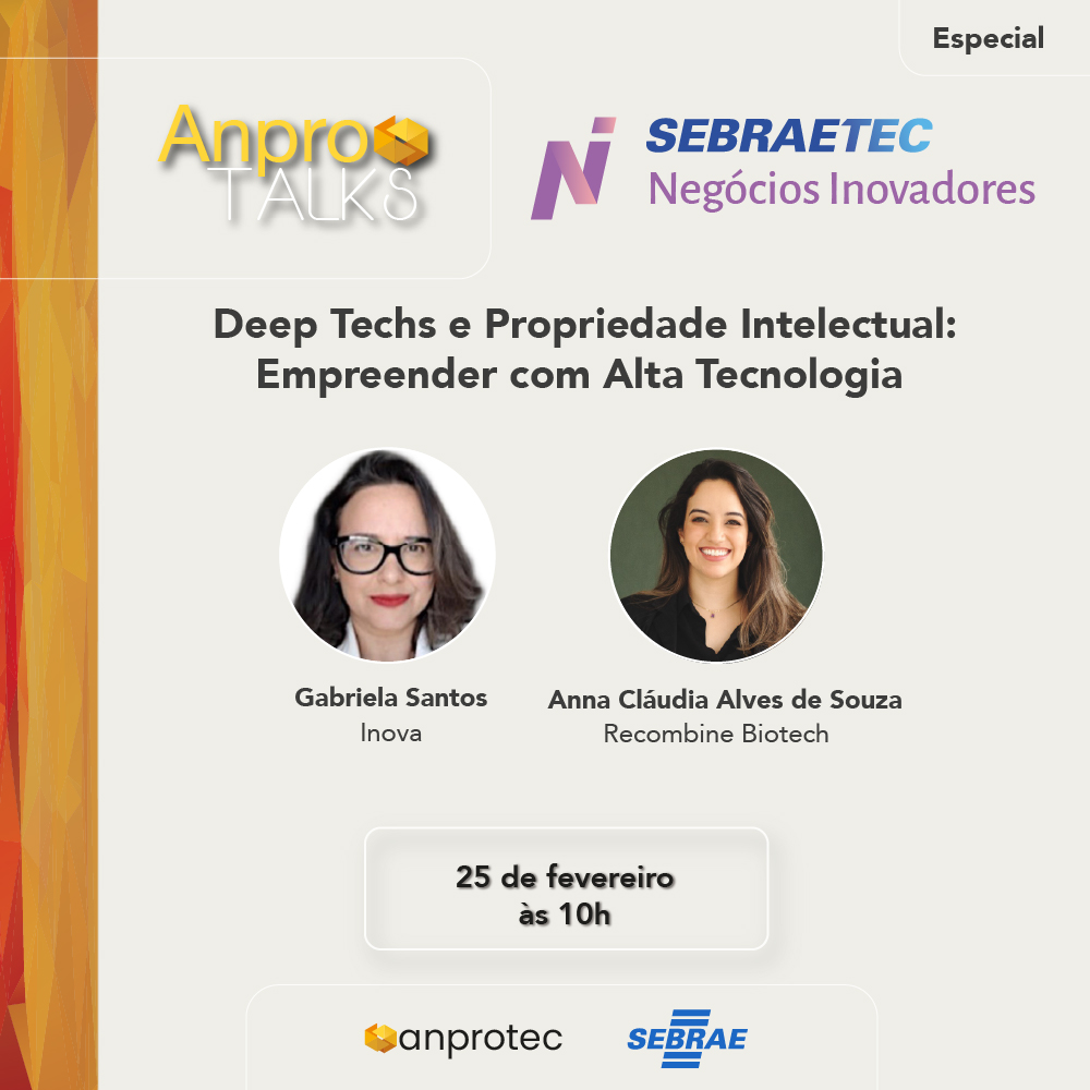 A Anprotec, em parceria com o Sebrae, realizou o webinar especial “Deep Techs e Propriedade Intelectual: Empreender com Alta Tecnologia”. O encontro realizado nesta quarta-feira (25) faz parte do ciclo de capacitações online do programa Sebraetec Negócios Inovadores (NI).