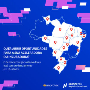 O ciclo 2026 do programa Sebraetec Negócios Inovadores (NI) está começando, e 16 Sebraes estaduais estão com credenciamento aberto para incubadoras e aceleradoras que desejam atuar como prestadoras de serviço no programa. A iniciativa é promovida nacionalmente pelo Sebrae, em parceria com a Anprotec.