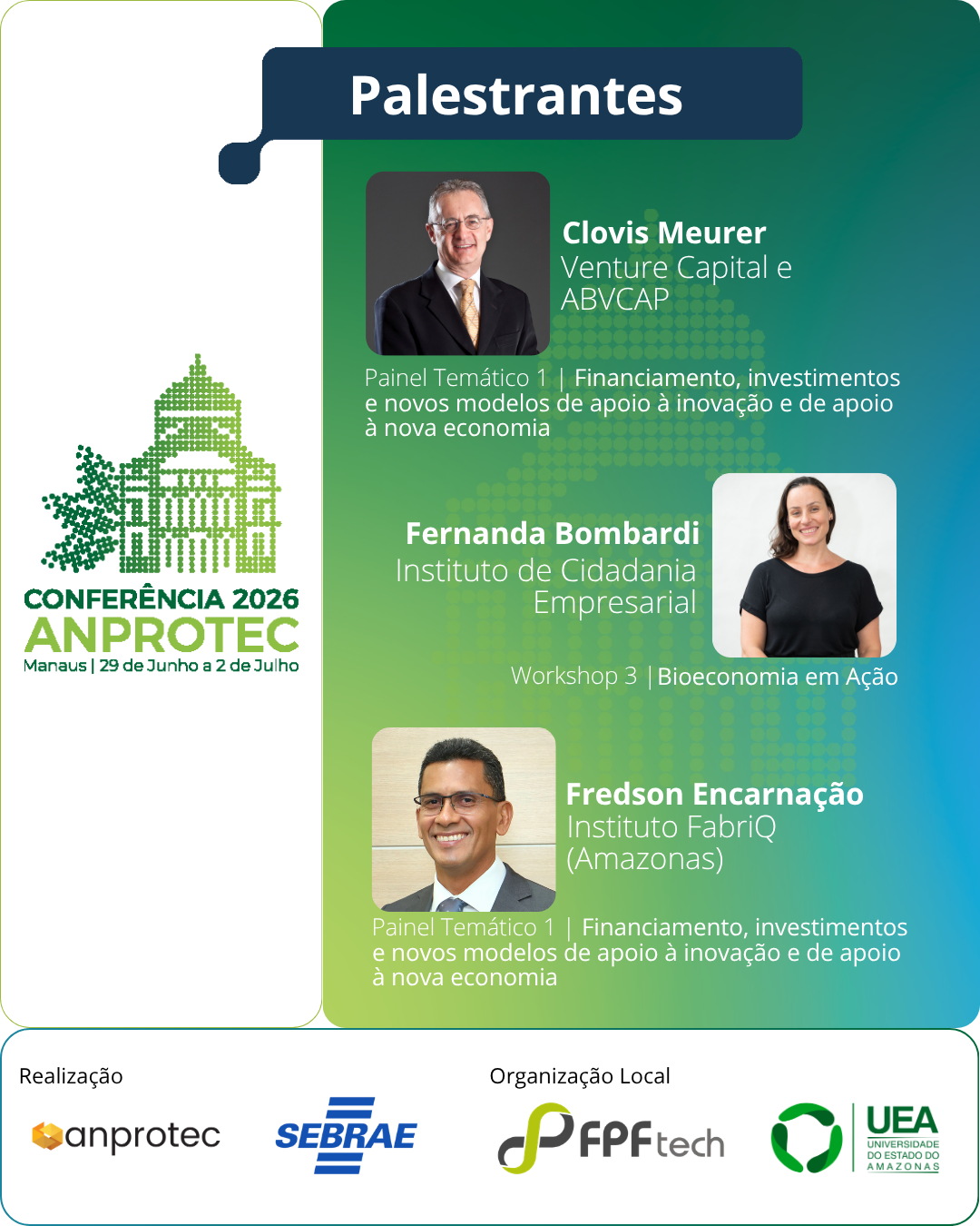 Na Conferência Anprotec 2026, participará do “Painel Temático 1 – Financiamento, investimentos e novos modelos de apoio à inovação e de apoio à nova economia”, no dia 30 de junho, às 14h. Fredson contribuirá com o debate sobre fundos, capital de risco, fomento público-privado e instrumentos financeiros.