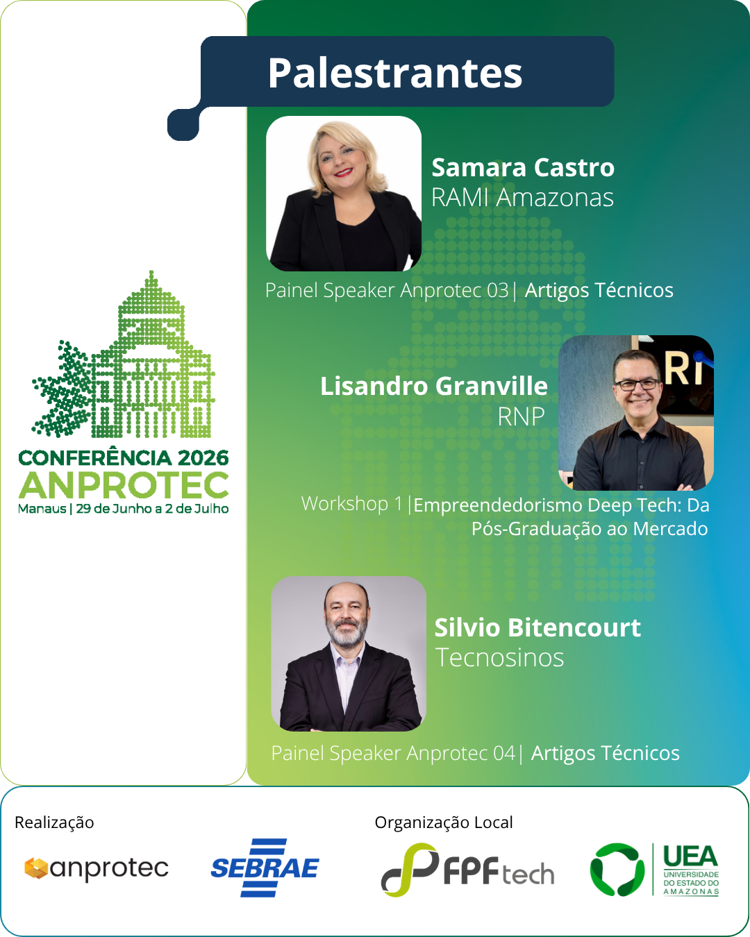 A 36ª Conferência Anprotec de Empreendedorismo e Ambientes de Inovação divulga novos palestrantes que farão parte da extensa programação do evento. A Conferência será realizada de 29 de junho a 2 de julho, em Manaus (AM). Samara Castro, Lisandro Granville e Silvio Bitencourt trarão diferentes perspectivas sobre o fortalecimento de ecossistemas de inovação, conectando ciência, gestão e desenvolvimento territorial.