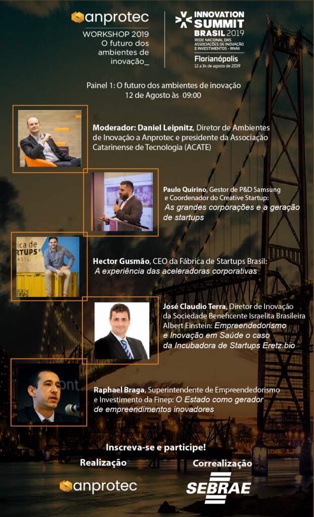 Com moderação do diretor de ambientes de inovação da Anprotec e presidente da Associação Catarinense de Tecnologia (ACATE), Daniel Leipnitz, o debate conta com convidados como Hector Gusmão, CEO da Fábrica de Startups Brasil, que irá falar sobre a experiência das aceleradoras corporativas; Paulo Quirino, gestor de P&D Samsung e coordenador do Programa Samsung Creative Startup, em parceria com a Anprotec, que abordará a relação das grandes corporações e a geração de startups; José Claudio Terra, diretor de inovação da Sociedade Beneficente Israelita Brasileira Albert Einstein, que irá expor sobre empreendedorismo e inovação em saúde, e apresentar o caso da Incubadora de Startups Eretz.bio; e Raphael Braga, superintendente de empreendedorismo e investimento da Finep, que irá falar sobre o Estado como gerador de empreendimentos inovadores.